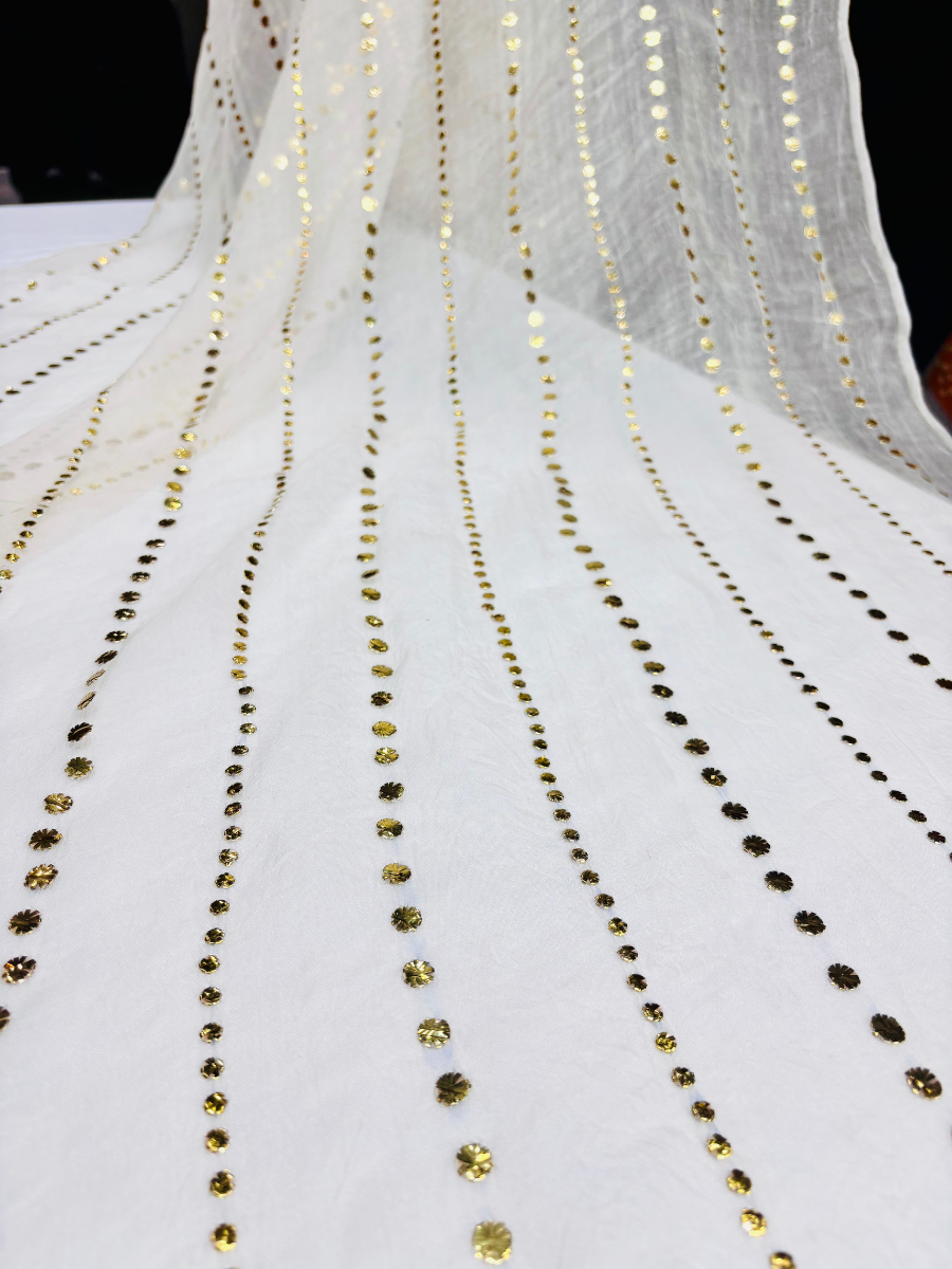 Elevate your next custom design with this exquisite Pure Organza fabric, featuring dazzling, hand-applied Mukesh work. The fabric offers a crisp yet soft drape and a beautiful, ethereal transparency.