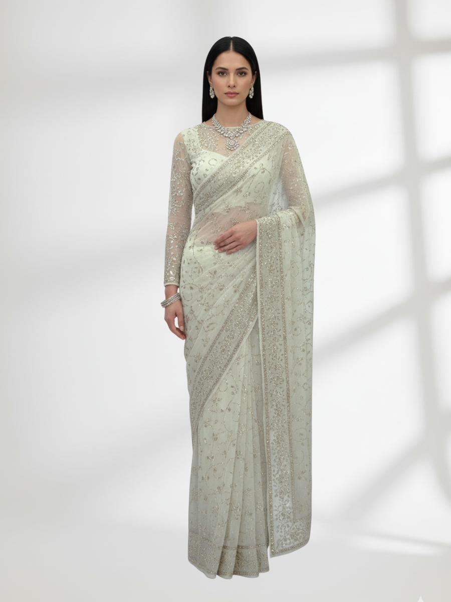Glow with elegance in this beautiful crinkle chiffon saree, adorned with delicate rose gold Mukesh work. Lightweight and flowing, it drapes effortlessly, making it perfect for weddings, parties, and festive occasions. A seamless blend of traditional artistry and modern charm.