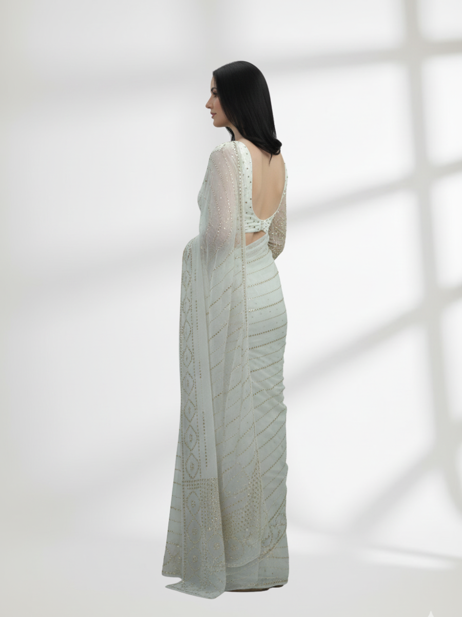 Step into elegance with this stunning dull crinkle chiffon saree, beautifully adorned with intricate gold Mukesh work. Lightweight and graceful, it drapes effortlessly, perfect for weddings, parties, and festive celebrations. A timeless piece combining classic craftsmanship with modern charm.