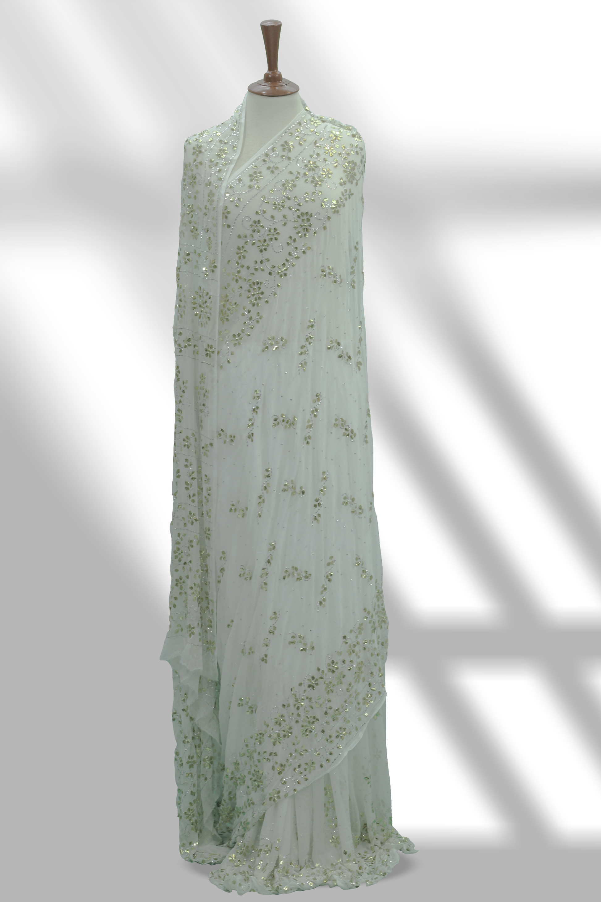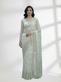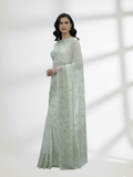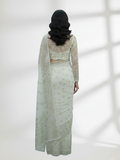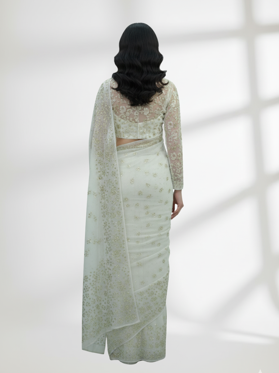 Shimmer in this elegant crinkle chiffon saree with intricate Mukesh work in a gold and silver mix. Lightweight and flowing, perfect for weddings, parties, and festive occasions. A timeless blend of traditional craftsmanship and modern charm.