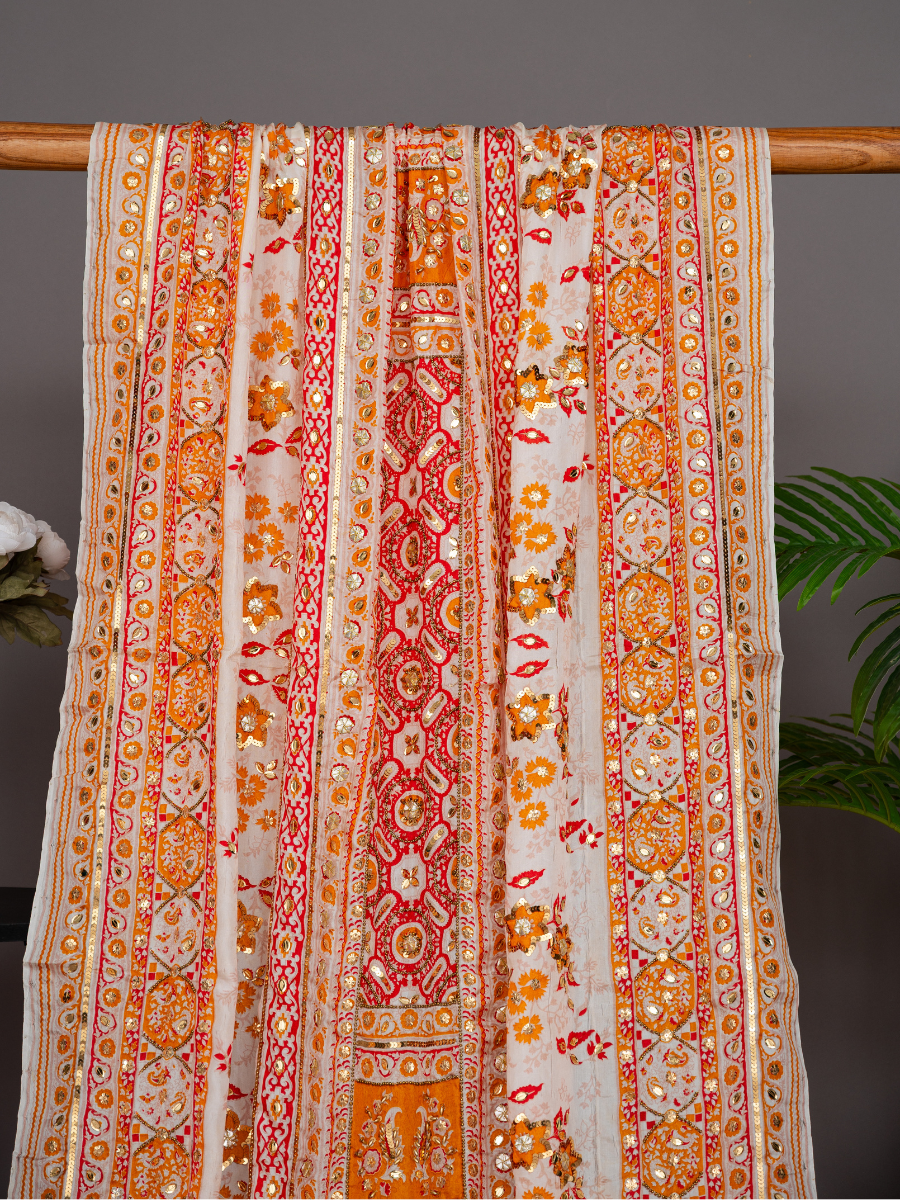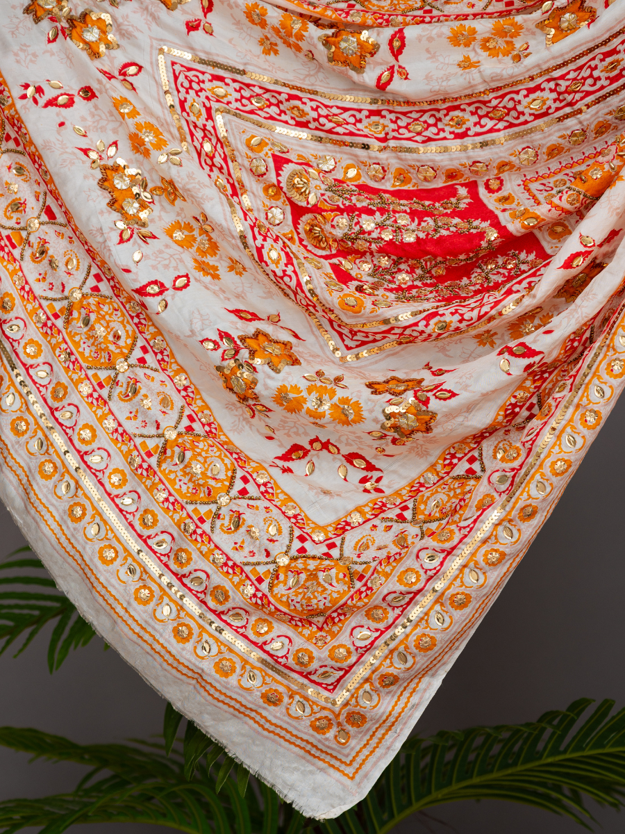 Elevate your ensemble with this exquisite Printed Silk Handwork Dupatta from Ever Shine — a timeless piece crafted for the discerning woman who values heritage luxury, artisanal craftsmanship, and conscious style.
