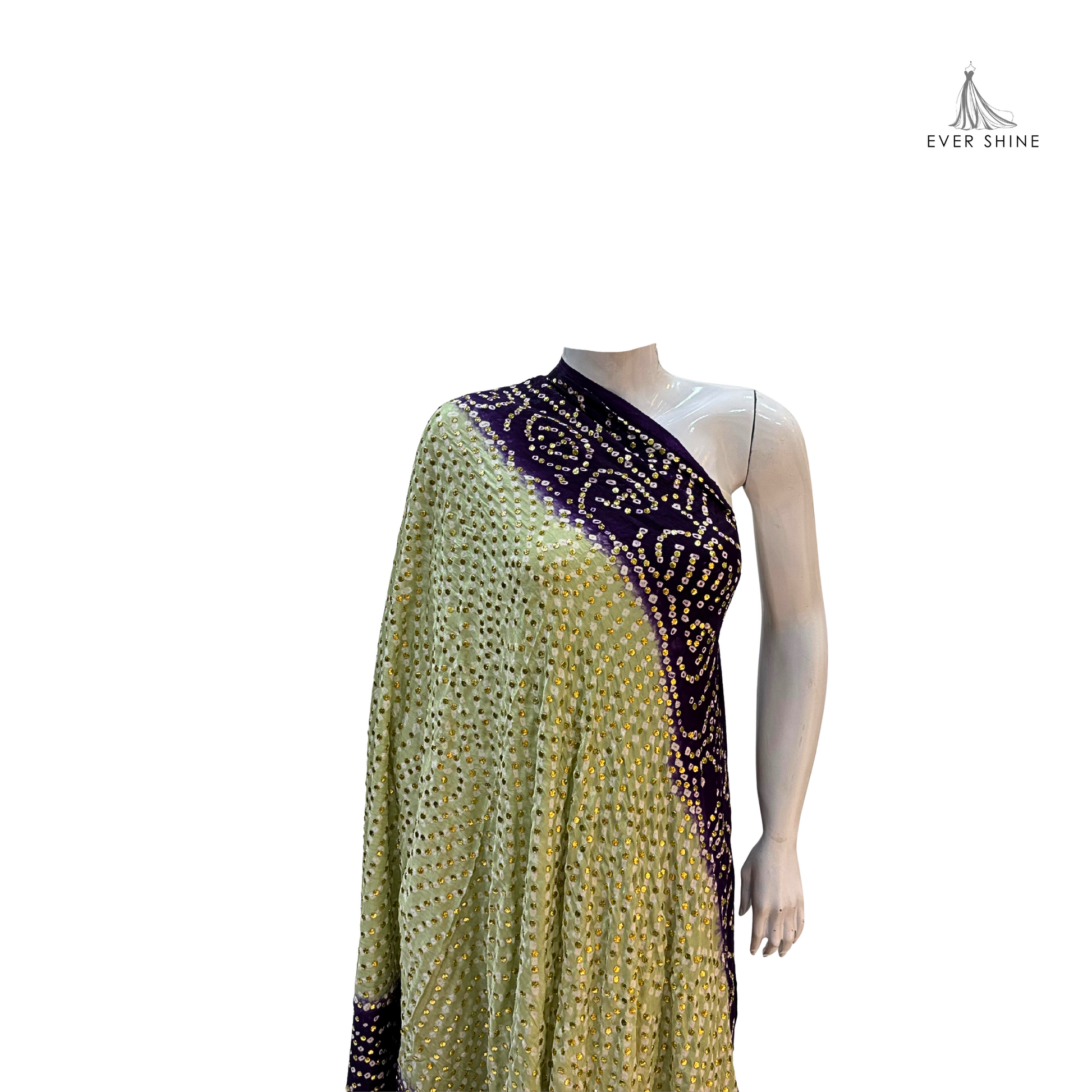 Contrast Section (Pallu/Border): A deep, rich, saturated Dark Purple or Eggplant Purple, bordering on a very dark indigo. This color provides a dramatic and luxurious contrast to the pale green.