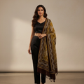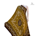 Accent/Detailing: The intricate patterns (likely Bandhani or tie-dye with embellishment) are done in a light color, such as Cream, Off-White, or Pale Gold, making them pop against both the golden and dark brown sections. The very edge also features bright metallic Gold striping.